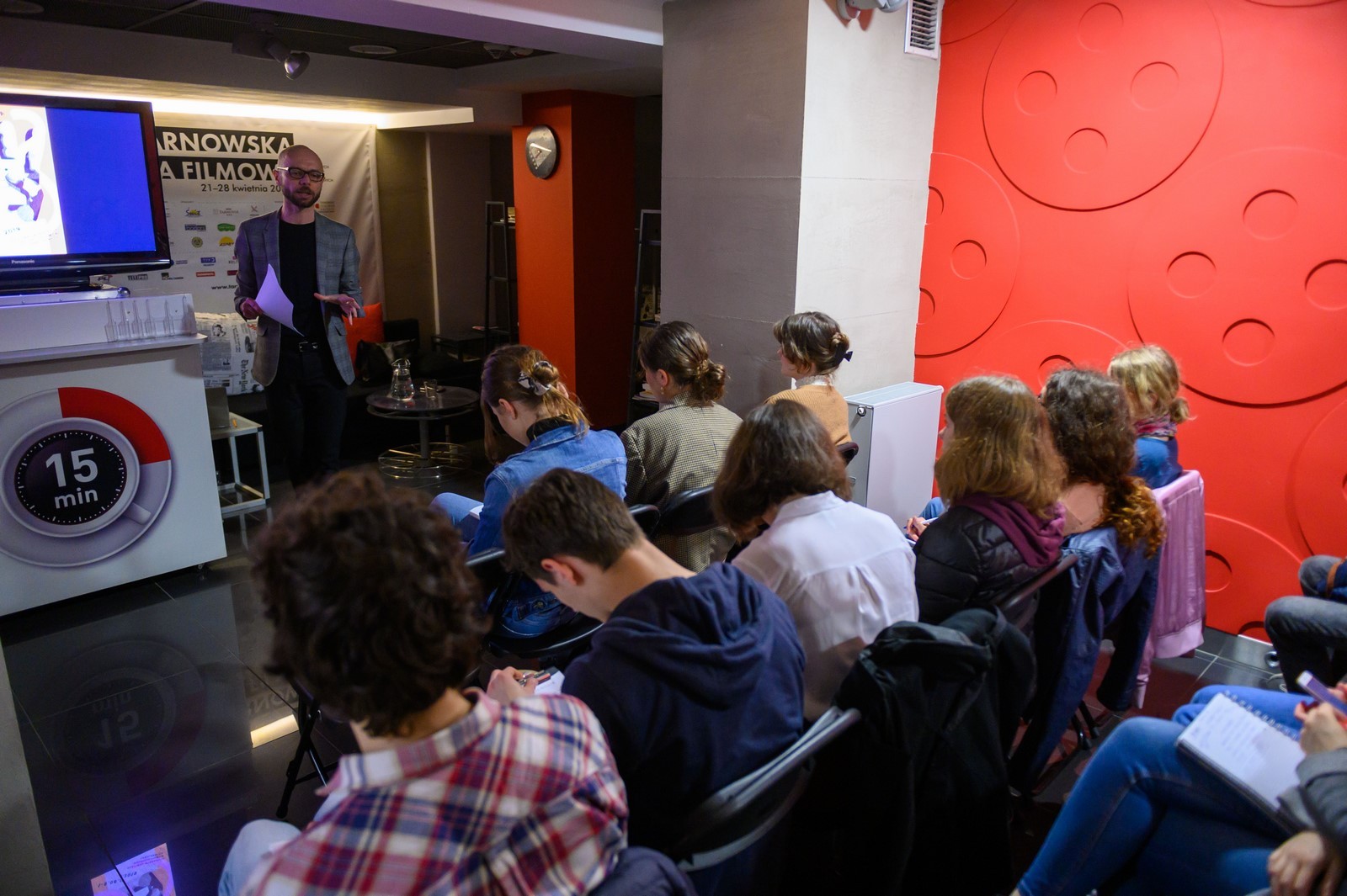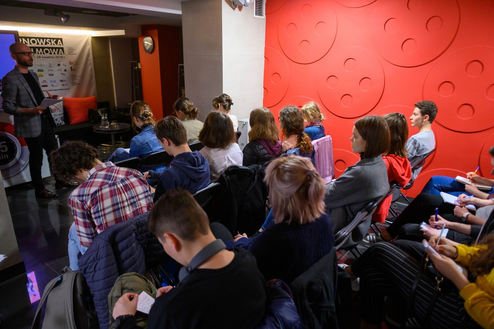 Wykład, w którym udział wzięli chętni do pracy w Jury Młodzieżowym oraz osoby zainteresowane poprowadził dr Sebastian Jagielski, adiunkt w Instytucie Sztuk Audiowizualnych Uniwersytetu Jagiellońskiego, który specjalizuje się w historii kina polskiego.